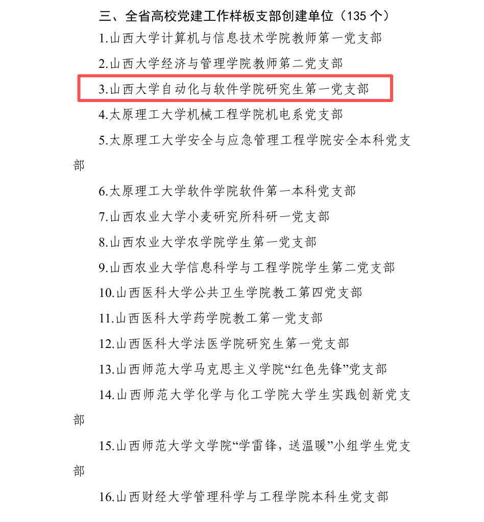 近日,山西省教育厅公示“全省高校党建工作样板支部”入选名单,太阳集团城娱8722研究生第一党支部凭借其在新工科背景下探索形成的“三融四创”党建育人新模式成功入选。这一荣誉是我院继教师第一党支部后获得的第二个省级样板,更标志着学生党支部在此领域实现了“零的突破”,是学院基层党建工作迈上新台阶的重要标志。